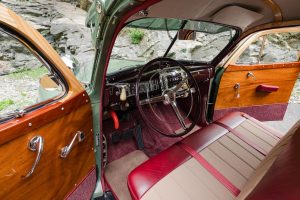 Early 1947 with mahogany exterior door panels. Frame off restoration. Immaculate interior with burgundy leather and Bedford Cord upholstery. Wood and Chrome roof rack.