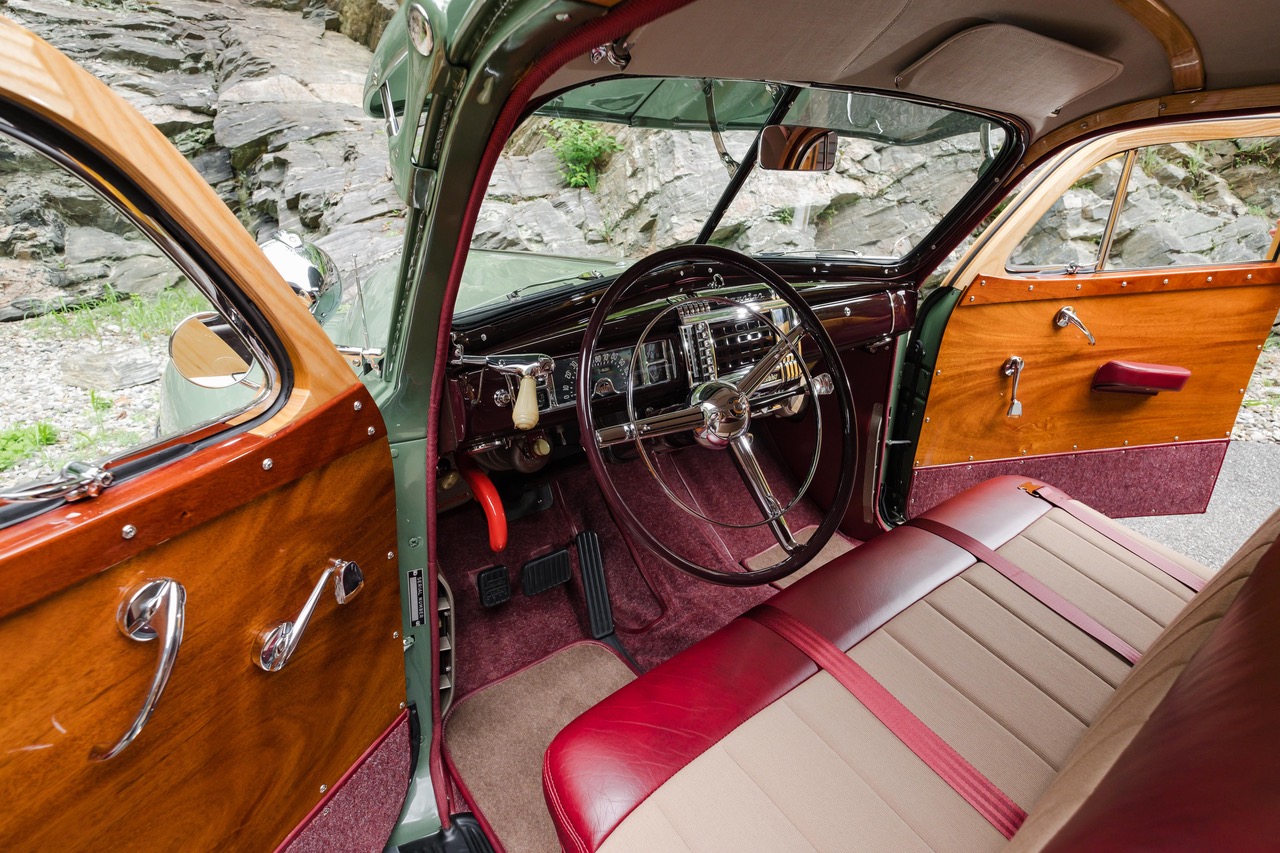Early 1947 with mahogany exterior door panels. Frame off restoration. Immaculate interior with burgundy leather and Bedford Cord upholstery. Wood and Chrome roof rack.